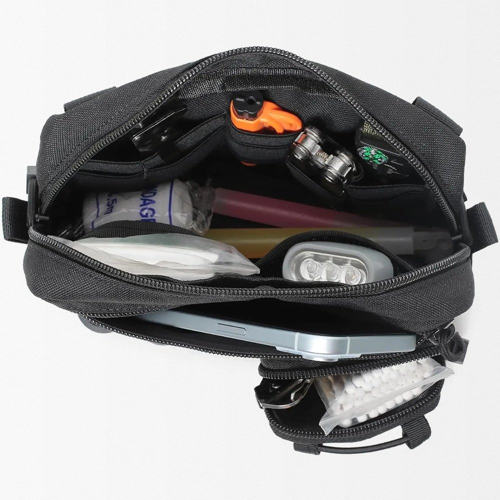 Esta bolsa táctica, fabricada en resistente nylon 1000D, está diseñada para caza y actividades outdoor. Su tamaño compacto ofrece amplio espacio con varios compartimentos y bandas elásticas. Disponible en negro, tan y verde, se fija fácilmente a chalecos y mochilas, garantizando acceso rápido a tu equipo esencial en cualquier situación.