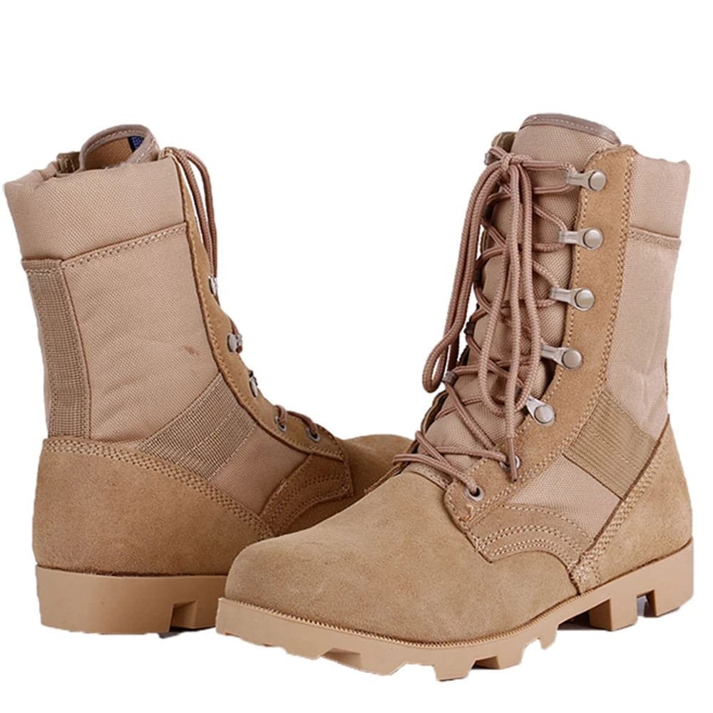 Diseñadas para entornos exigentes, estas botas de ante color arena son ideales para aventuras en primavera y otoño. Perfectas para profesionales militares y amantes de actividades al aire libre, ofrecen un agarre excelente en terrenos variados. Su diseño con cordones garantiza un ajuste firme, mientras que el patrón camuflado se integra perfectamente en entornos naturales.