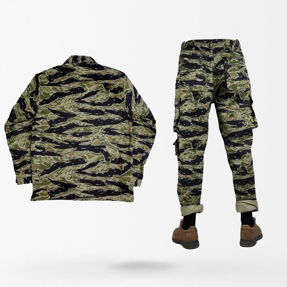 Descubre el icónico camuflaje Tiger Stripe Vietnam, confeccionado en algodón resistente que garantiza comodidad y transpirabilidad. Ideal para misiones tácticas o para aficionados al airsoft, este conjunto te permite mimetizarte perfectamente en entornos selváticos. Su patrón distintivo y colores vibrantes lo convierten en un imprescindible para cualquier equipo táctico serio.