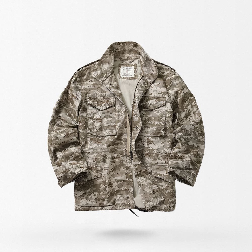 Mantente abrigado y seco con la chaqueta M65 Vintage en camuflaje desierto digital. Ideal para camping y senderismo, esta chaqueta impermeable, cortaviento y térmica es perfecta para aventuras en invierno. Fabricada con algodón resistente y forro de poliéster, ofrece comodidad y protección en terrenos exigentes.