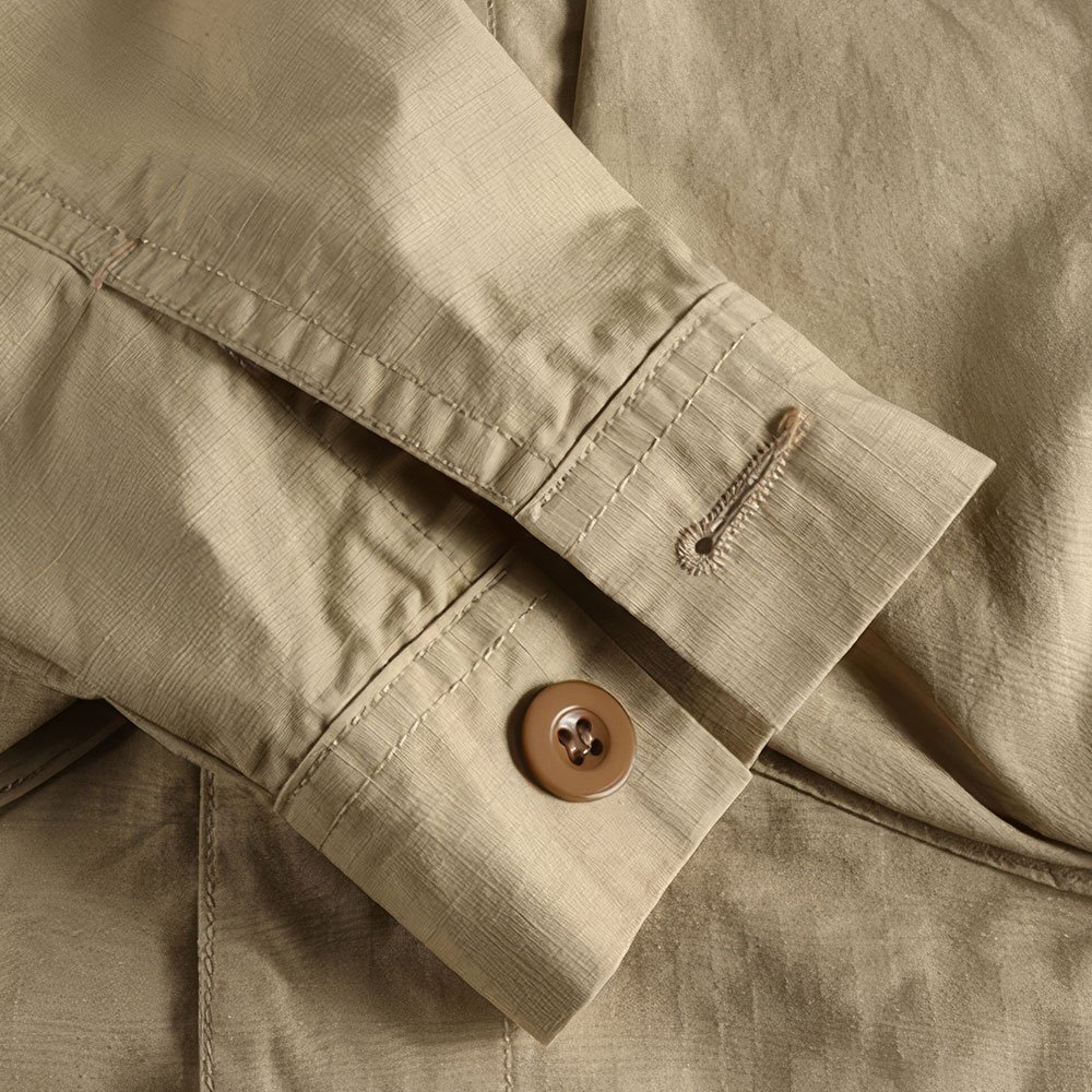 Esta chaqueta militar vintage es perfecta para salidas casuales en primavera y otoño. Fabricada en algodón resistente, cuenta con cierre de un solo pecho y mangas largas para ofrecer confort y estilo. Su diseño sin cuello aporta un toque original, ideal para llevar en capas durante los días frescos. Disponible en varios colores.