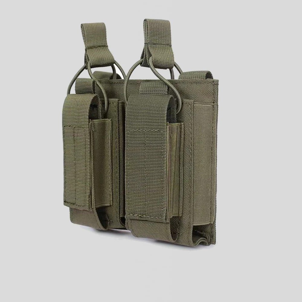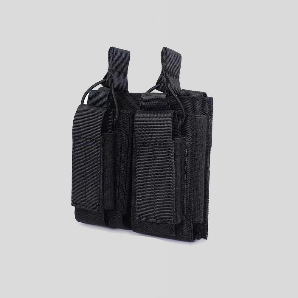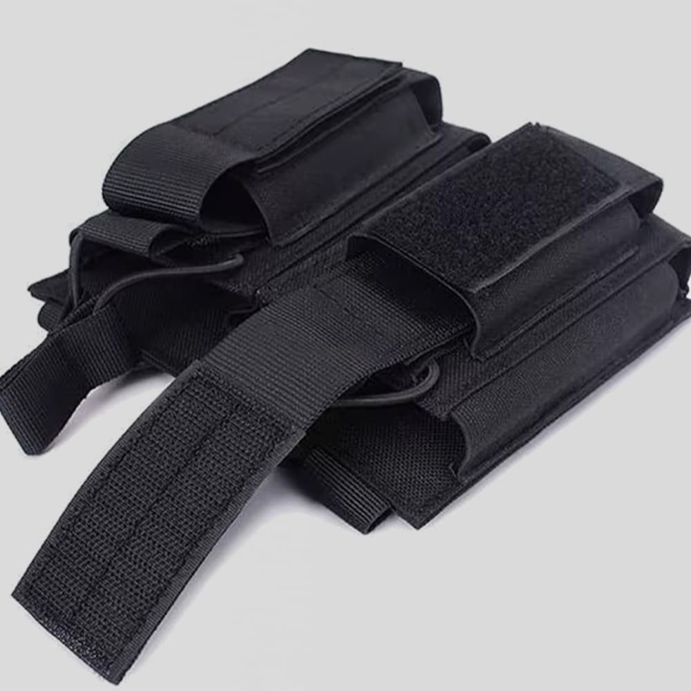 Fabricada en nylon resistente, esta funda doble para cargadores M14 garantiza un acceso rápido y almacenamiento seguro. Perfecta para operaciones tácticas o airsoft, su compatibilidad MOLLE permite integrarla fácilmente en chalecos y mochilas. Disponible en negro, verde y arena, es la opción confiable para cualquier misión.