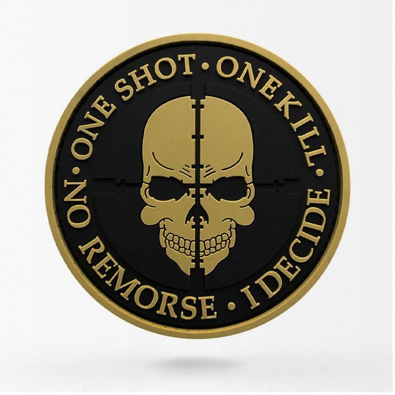 Demuestra tu puntería con nuestro parche «Un disparo, una muerte». El diseño de la calavera junto con el lema simboliza precisión y exactitud. Muestra tu compromiso de acertar al blanco con un solo disparo.