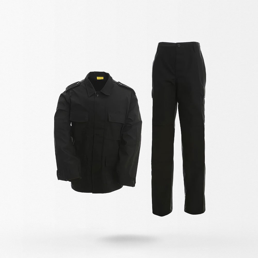El uniforme de combate BDU negro es ideal para actividades al aire libre en primavera, verano y otoño. Perfecto para airsoft, caza y entrenamientos tácticos, su mezcla de 65% poliéster y 35% algodón asegura durabilidad y comodidad. Disponible en tallas XS a 2XL.