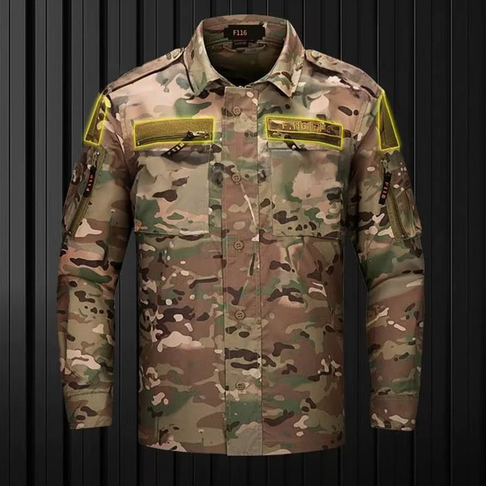 Diseñado para cualquier época del año, el Uniforme de Combate de Seguridad F116 es ideal para actividades al aire libre. Su mezcla resistente de 65% poliéster y 35% algodón garantiza comodidad y durabilidad. El patrón de camuflaje y el cuello mao aportan un toque militar, perfecto para diversos terrenos y condiciones climáticas.